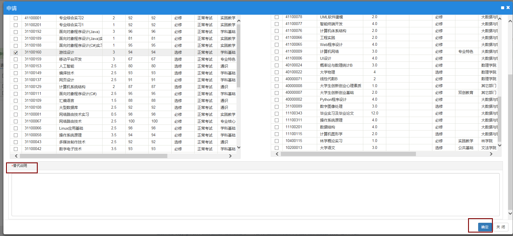 5、在课程下面有个“替代说明”,写清楚申请替换的原因(是否符合学分替换的规则等)(这是必填项,必须填写),然后点右下角的“确定”。