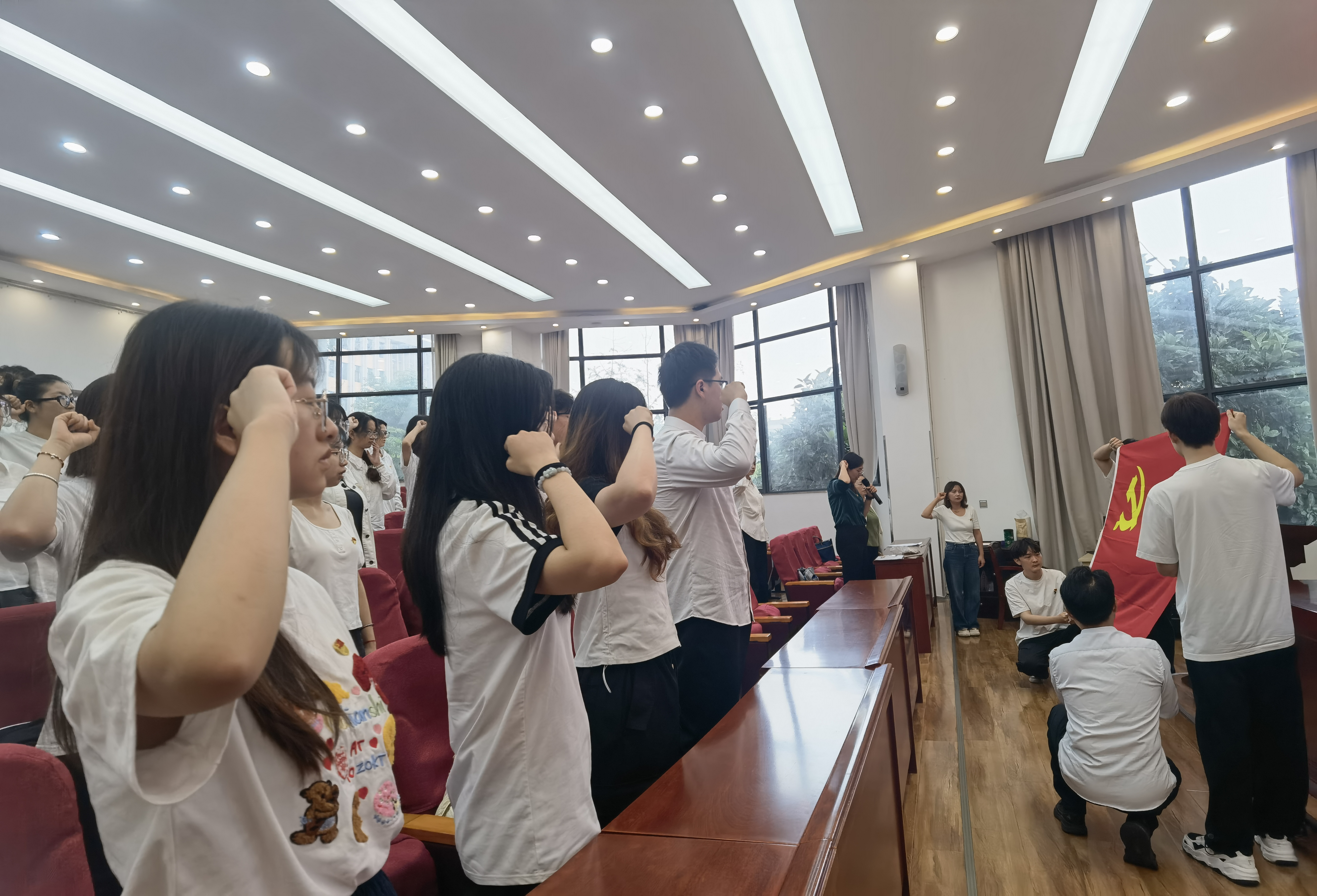在领誓人韩洁同志的带领下,全体新党员面向鲜红的党旗,整齐列队,庄严地举起右手,握拳过肩,以洪亮而坚定的声音宣读入党誓词。誓言字字铿锵,句句有力,表达了新党员们对党的无限忠诚和为共产主义事业奋斗终身的坚定决心。在场的老党员们也一同重温入党誓词,再次接受心灵的洗礼,坚定理想信念。