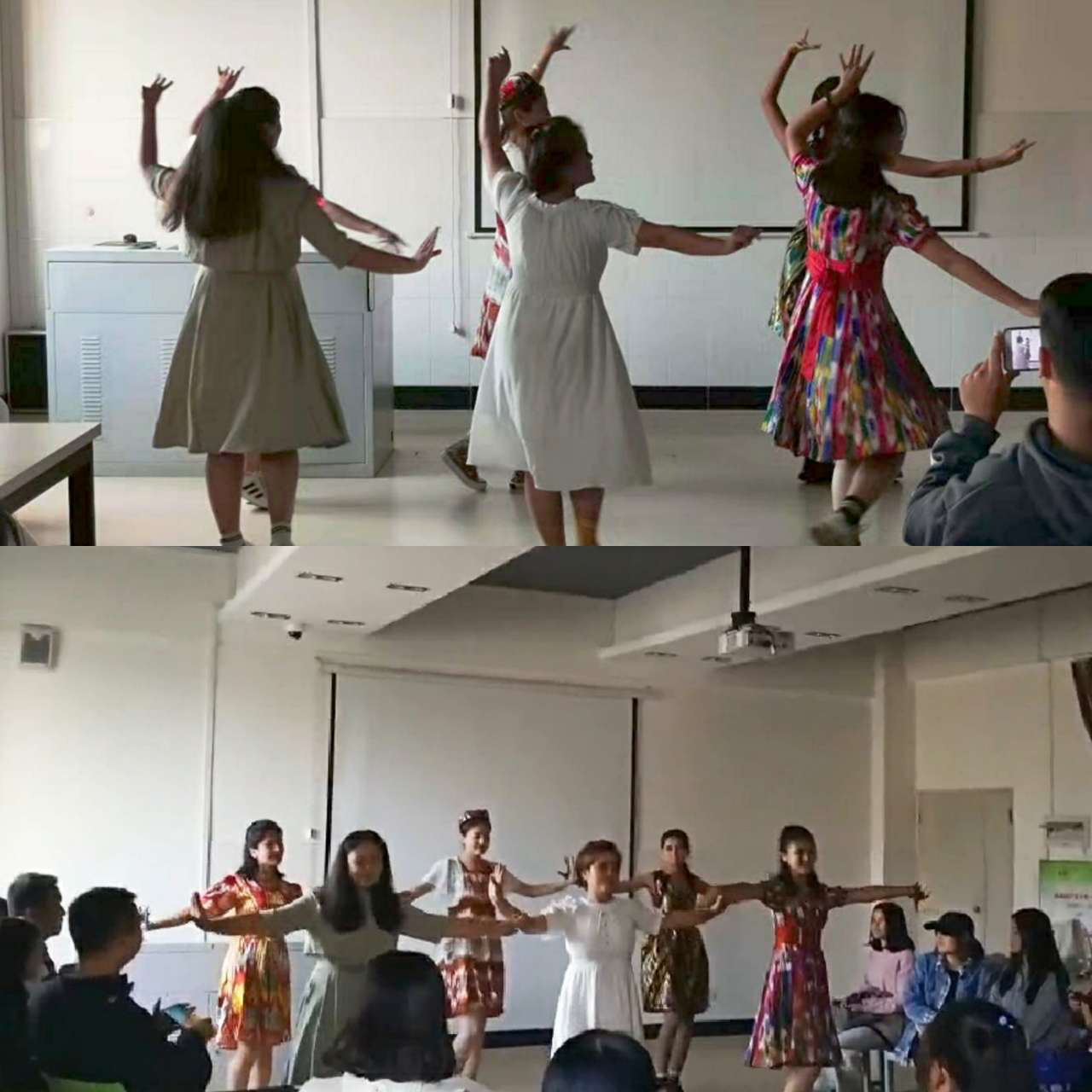 民族文化分享结束后,刘俊伟老师对此次班会进行了总结讲话,鼓励同学们要抓住四年大学时光不断提升综合能力、努力提升思想修养,为班集体建设增砖添瓦。在和谐友爱的气氛中,刘俊伟老师向每个民族的代表同学慰问颁奖。活动的最后,新疆姑娘们集体献舞,迷人的音乐与优美的舞姿引得一阵又一阵掌声。