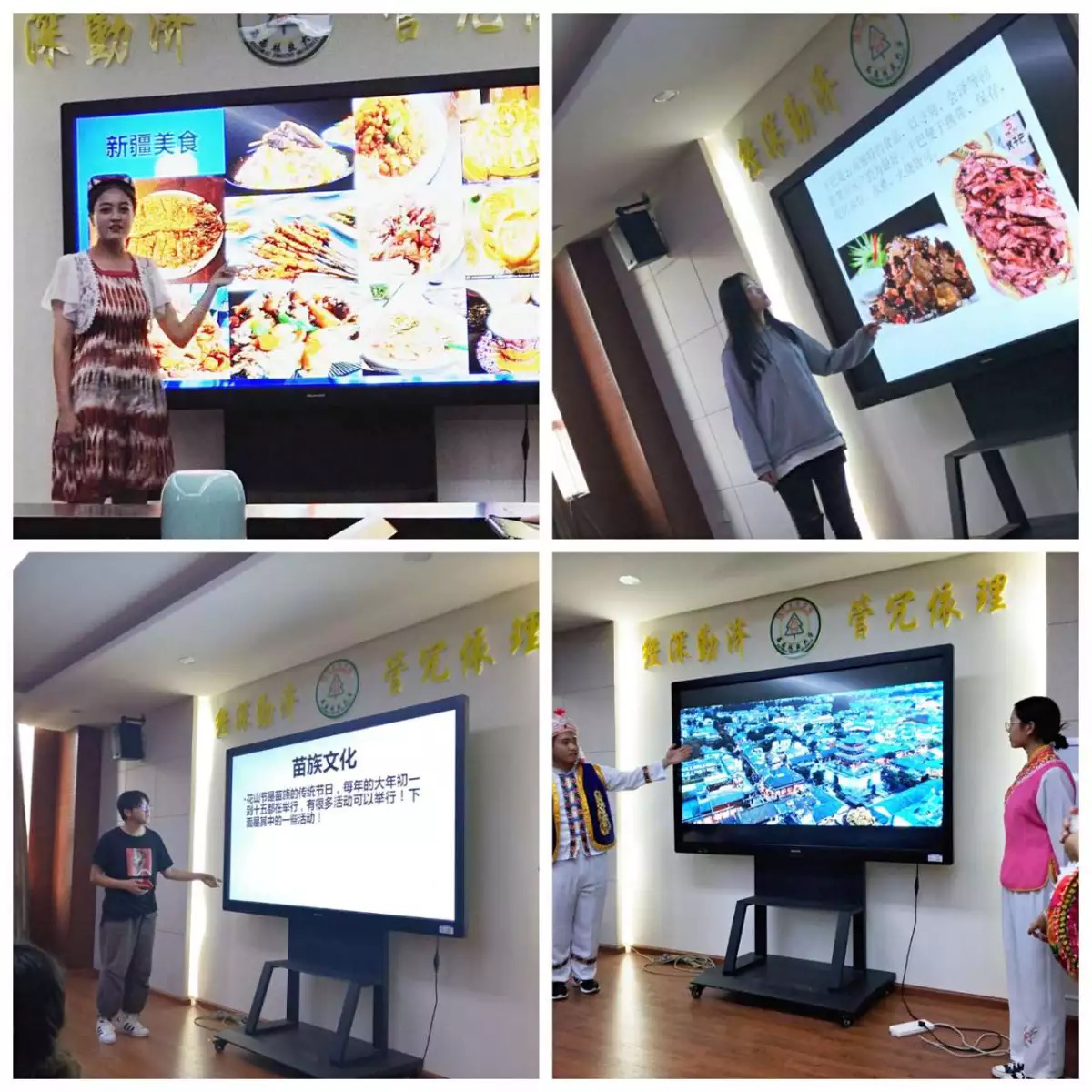 班级同学分别来自汉族、维吾尔族、白族、苗族、回族、壮族、彝族和哈尼族八个民族,每个民族代表同学都从民族语言、文字、习俗、节日、美景、美食等方面进行民族文化分享。从回族开斋节到彝族火把节,从汉族江南地区的东坡肉到新疆维吾尔族的烤羊肉串,从绚烂多彩的维吾尔族艾德莱斯绸到浪漫优雅的白族“风花雪月”,同学们身着民族特色服饰各显其长,用朗诵、歌曲、舞蹈、书画、音乐与视频等丰富多样的形式,为全体师生带来了一场民族文化视听盛宴。会间,胡晓老师与各民族代表同学亲切交流,班会气氛朝气蓬勃、其乐融融。