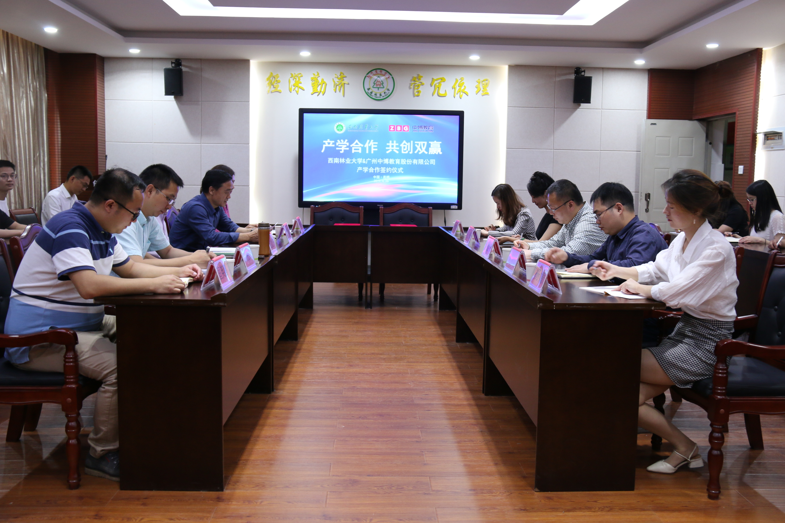 罗明灿经理主持本次签约仪式。首先,赵龙庆副董事长介绍公司的发展历史和概况,表示本次合作是对“三个结合”中加强校企合作关系的积极响应,并预祝本次合作取得成功。接着,毛金明董事长介绍了公司发展概况,表示中博教育将利用自身综合优势为员工带来更具备应用性与竞争力的国际财经金融知识。随后,张莅砾董事表示对此次产学合作充满期待。最后,赵龙庆与毛金明代表双方签约,双方代表合影留念。
